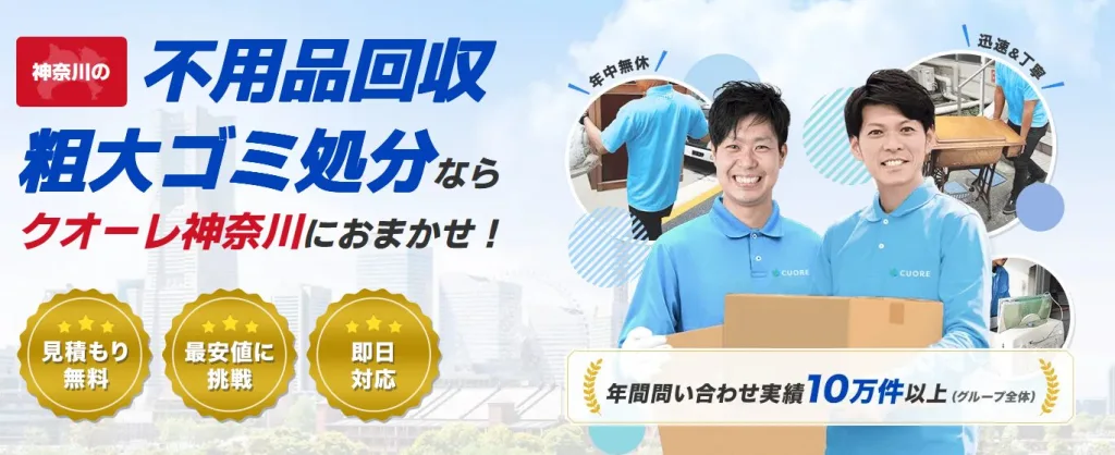不用品回収クオーレ横浜(運営:株式会社クオーレ)は、神奈川県横浜市を拠点に、家具・家電・粗大ゴミ・廃品などの回収サービスを提供しています。